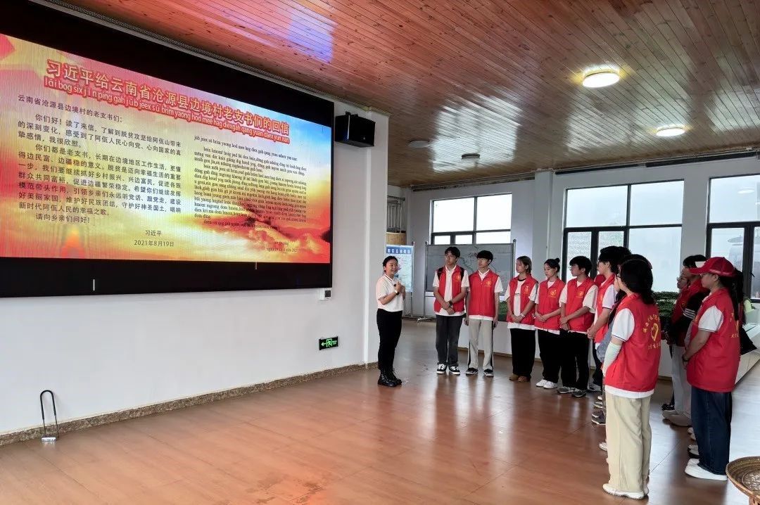 走进永和新村服务中心,习近平总书记给云南省沧源县边境村老支书们的回信映入眼帘,在实践队指导老师的带领下,实践队员们重温了习近平总书记给云南省沧源县边境村老支书们的回信,实践队员们纷纷表示将永远牢记习近平总书记的谆谆嘱托,永远听党话、感党恩、跟党走,珍惜韶华、学好本领,以“我们都是收信人”的奋进姿态投身于建设美丽家乡的伟大事业中,唱响新时代各族人民的幸福之歌。