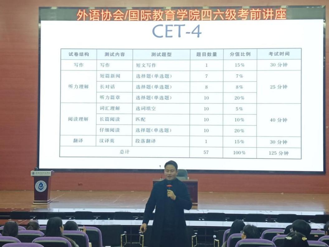 12月3日,国际教育学院携手外语协会,邀请外聘教师熊国李老师开展四、六级考前备考指导讲座,切实服务学生,助力我校学生备战大学英语四、六级考试。