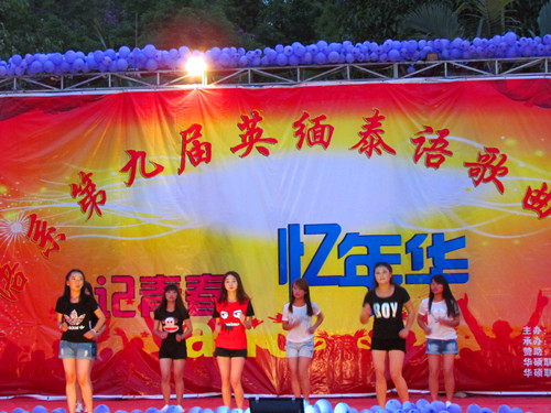 (校园记者 周应香)2014年4月26日晚7时,外语系在球场舞台成功举办第九届英缅泰语歌曲大赛。