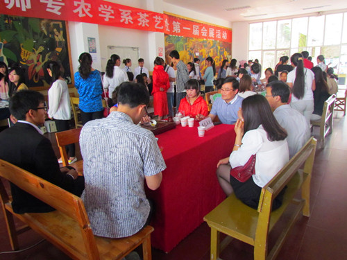 本次活动分为七个展区,分别是茶文化小知识、茶艺展区、茶具展区、茶叶展区、表演品茗区、有奖竞答区、留言处。其中,茶具展区的紫茶壶、品茗杯、荷花香台和元宝茶工艺品最为老师和同学所关注并得到大家的一致好评。茶叶展区展出古树晒青茶、白茶和龙井,引来众多爱茶者观光。再看表演品茗区,一位茶艺员穿着清新淡雅,白色的旗袍,白色的茶具,与茶道去芜存菁的理念相得益彰,表演者举手投足,专注、自信,在茶汤潺潺流泻间,安之若素,想来,这就是在茶道中培养出的独特气质,把冲泡好的茶汤敬奉给观光者品饮,品者称赞茶香沁人心脾。