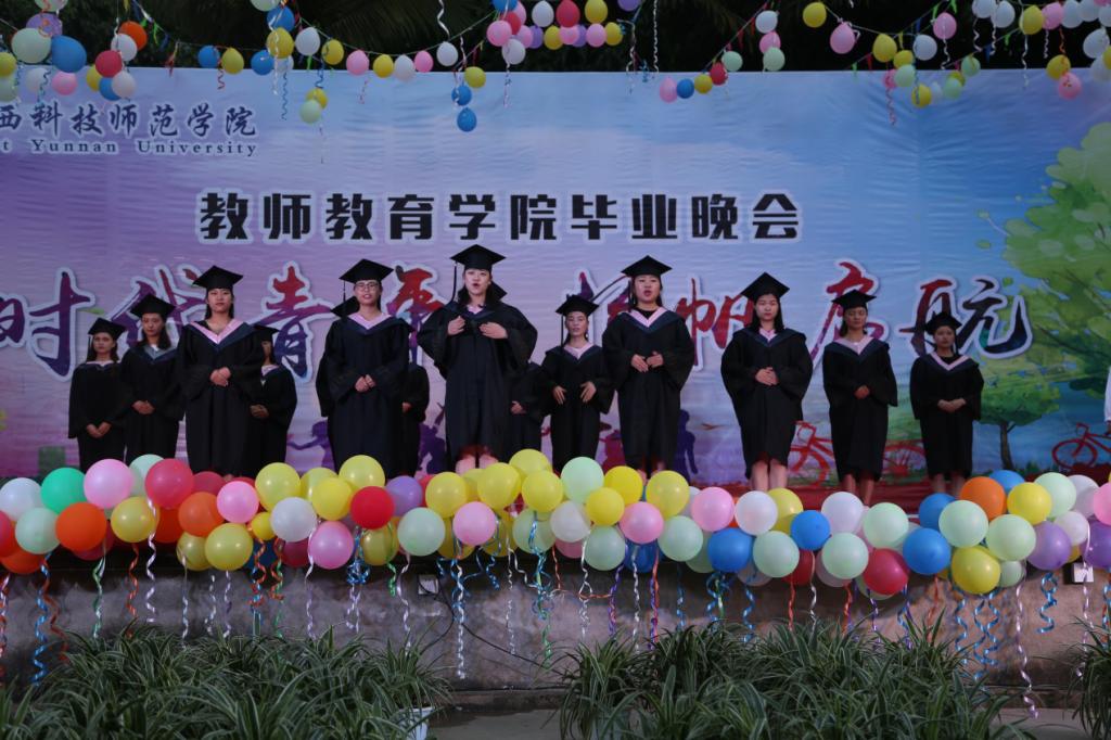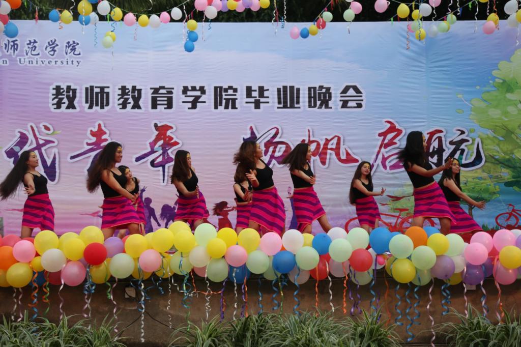 晚会内容丰富,充分彰显教师教育学院专业特色和民族特色,如《藏乡情》、《拉祜梦》、《侗乡之夜》把我们带到了少数民族风情中;诗朗诵《再别康桥》和歌曲《生如夏花》带来不舍的留恋,现代舞《迷宫》、《Sugar Free》劲爆十足;《儿歌联唱》仿佛回到了童年。14个节目用舞蹈、葫芦丝、手语、吉他、手鼓等不同的形式表达了对毕业生的祝愿,希望他们在未来的路上能不畏风雨、勇敢前行。