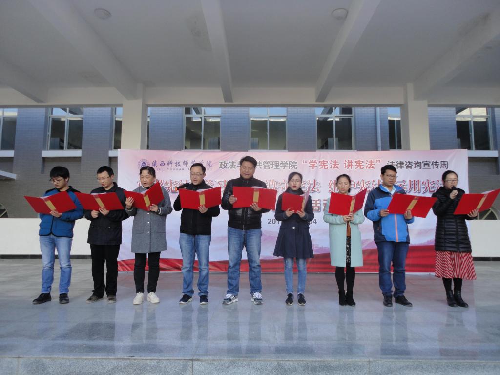 12月4日上午,政法与公共管理学院在学校同声传译室广场长廊举行2018年“12·4法律咨询宣传周”启动仪式。启动仪式上,师生诵读了《中华人民共和国宪法》部分条文。并进行了“尊崇宪法、学习宪法、遵守宪法、维护宪法、运用宪法”万名大学生签字活动。学校近千名师生参加启动仪式。