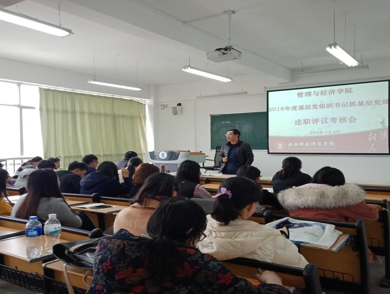 12月7日下午,管经学院在笃学楼614教室召开2018年度基层党组织书记抓基层党建述职评议考核会。学院党总支委员、党支部委员、专职组织员和部分师生党员代表参加了会议。