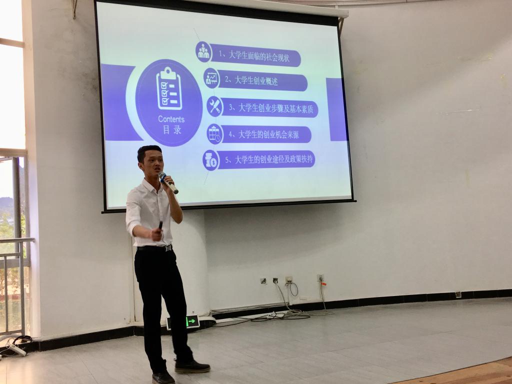 讲座中,祝吉良首先从大学生面临的社会现状抛砖引玉引出了大学生创业的相关概念,随后用幽默风趣的语言从大学生创业步骤、创业者应具备的素质、创业机会来源、创业途径及政策扶持等方面进行了深入浅出的讲解。引导同学们要认识自我,依据自身的特点,明确目标,要能想、敢想、能干、会干,在未来的职业生涯中克服传统思维,运用创新思维,不断地提升自己,实现自己的职业梦想。最后,祝吉良还给同学们分享了一个他指导的获得省级二等奖的创业项目,让同学们获益匪浅。