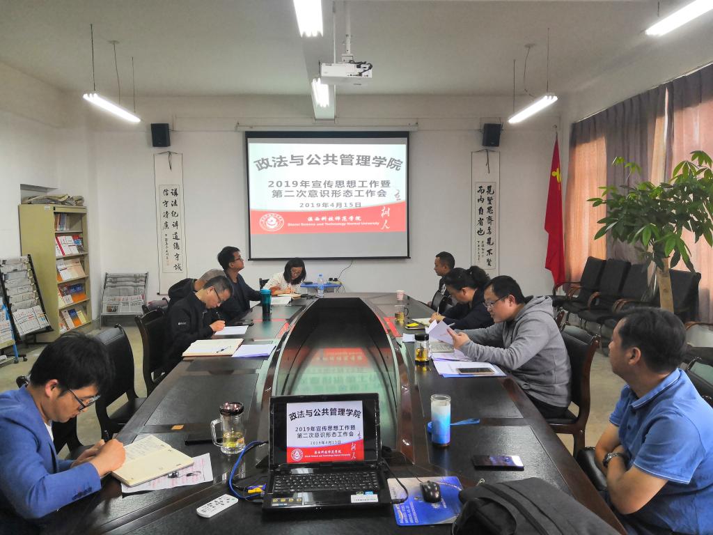 4月15日,政法与公共管理学院组织全体教师召开2019年宣传思想工作会暨第二次意识形态工作会。会议传达学习了学校党委2019年宣传思想工作要点,并指定专人根据党委文件要求细化学院工作方案。会议听取各班班主任关于学生意识形态领域的情况汇报,并进行分析和研判。会议要求全体师生务必紧绷住意识形态这根弦,各班要结合扫黑除恶专项斗争工作要求,加大矛盾纠纷排查力度,进一步关注师生思想行为动态,及时掌握情况,做到及时发现、及时分析、及时处理。