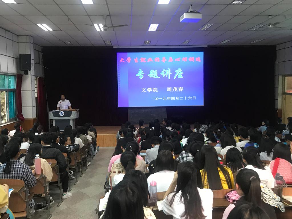 为引导文学院毕业生及早了解就业形势,鼓励毕业生勇于接受挑战,直面现实生活,提高毕业生初次就业率和年终就业率,4月26日,文学院在电教楼阶梯教室举办大学生就业指导与心理调适讲座。