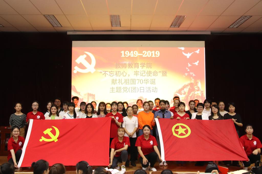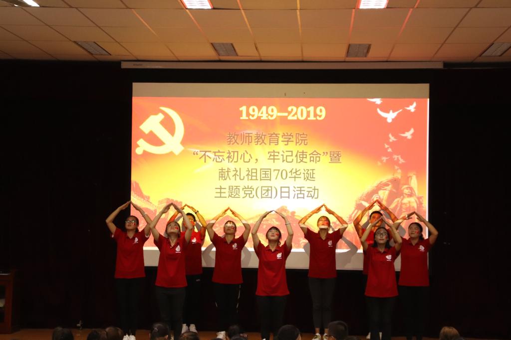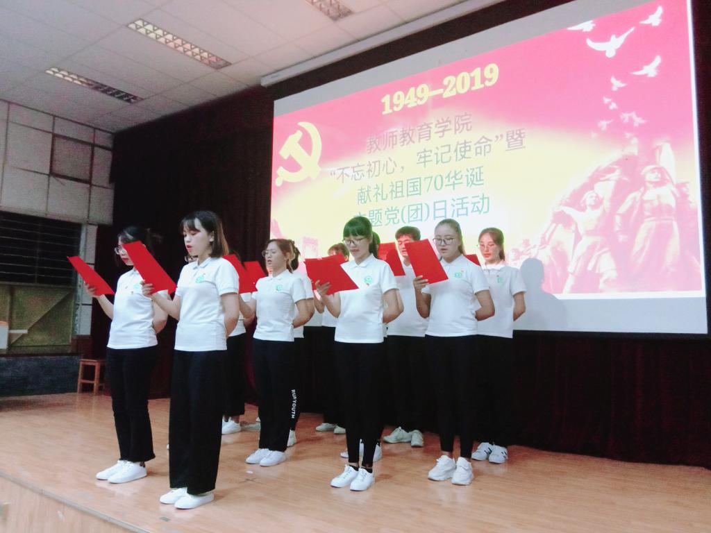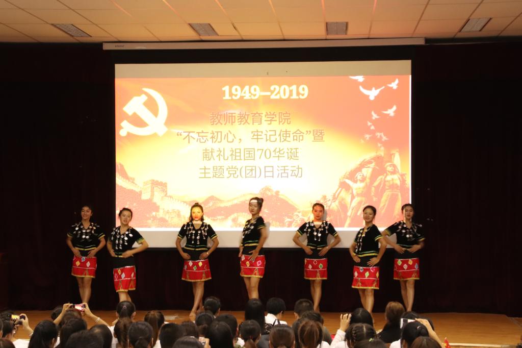 9月28日晚,教师教育学院在电教馆举行了献礼祖国70华诞主题党(团)日活动,集体唱国歌,重温入党入团誓词,并以多种形式表达了对祖国的热爱和最崇高的敬意:有手语《国家》、朗诵有《祖国,您好!》、《祖国颂》、《托起中国梦》等,合唱有《我和我的祖国》、《人民军队忠于党》、《我爱你中国》等,舞蹈有《芳华》和《景颇姑娘》。