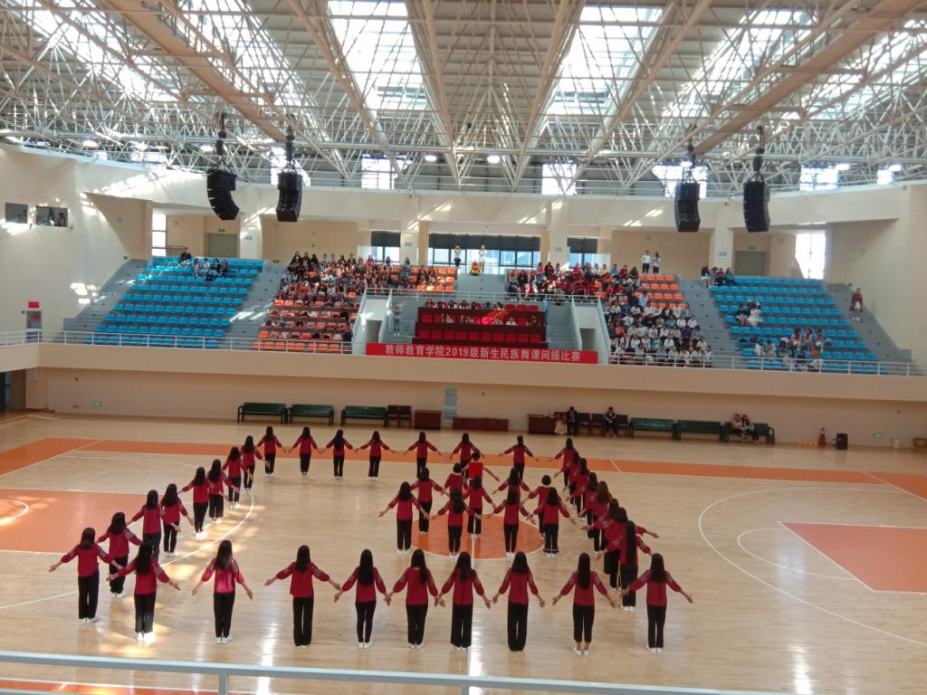 为了贯彻“不忘初心、牢记使命”主题教育的要求,使2019级新生体会民族传统优秀文化,树立文化自信。10月20 日,教师教育学院在体育馆举行2019级新生民族舞课间操比赛,共有11个19级新生班参赛,参赛曲目是《加林赛》、《莫罕丽》、《再唱山歌给党听》,奖项设置一个一等奖、两个二等奖、三个三等奖和五个优秀奖。评委们从动作、表情、服装、队形等方面进行评价。经过激烈的角逐,19级专升本二班荣获一等奖。