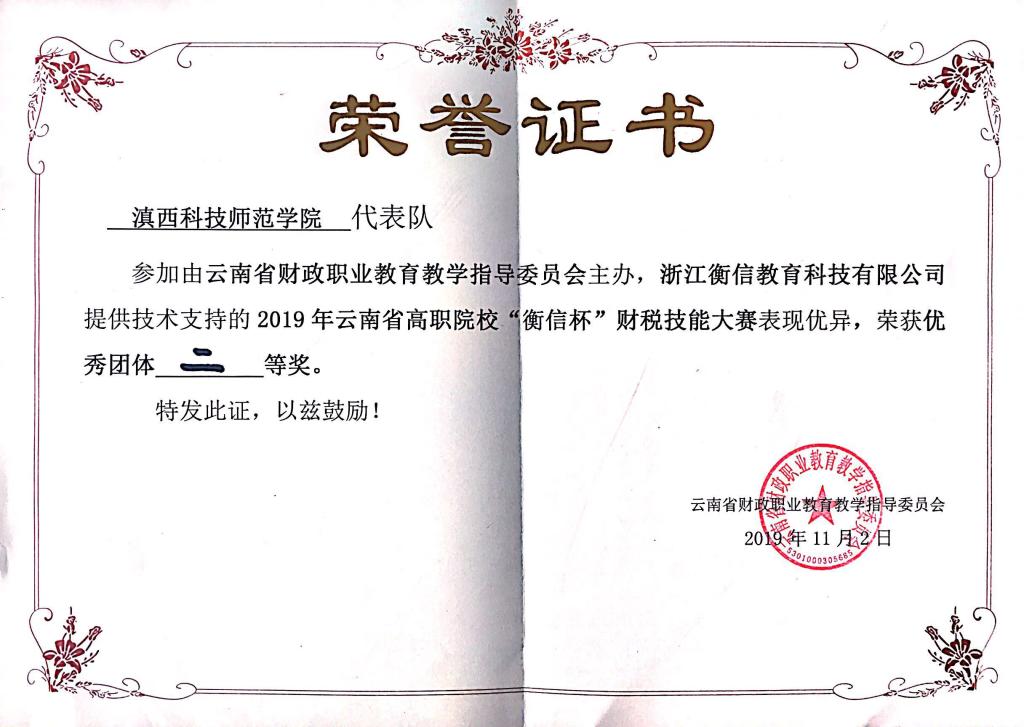 11月2日,由云南省财政职业教育教学指导委员会主办的2019年云南省高职院校“衡信杯”财税技能大赛在昆明冶金高等专科学校举行,在穆艳老师的指导下,管理与经济学院派出的两支参赛队伍,分别荣获团队二等奖、三等奖,宝威BVSports(中国)代表队荣获优秀团体二等奖。