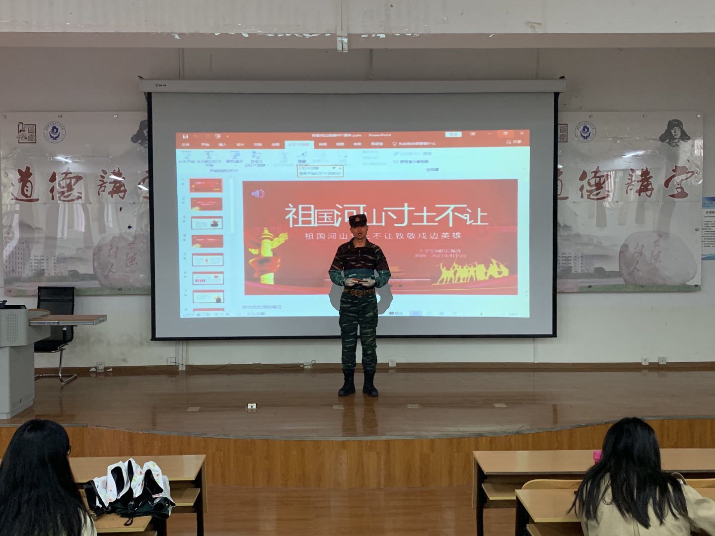 演讲活动在全体成员奏唱《义勇军进行曲》中拉开序幕。演讲开始,演讲者着军装上台,结合视频生动讲述了戍边英雄誓死保卫祖国寸土河山的戍边精神,深刻体现出“清澈的爱,只为中国”。活动播放了戍边英雄陈红军、陈祥榕、肖思远毫不畏惧、英勇战斗,壮烈牺牲,王焯冉在渡河支援途中为救助战友牺牲的视频。演讲结束,大学生国防后备连骨干们迈着整齐的步伐上台为同学们带来歌曲《中国军魂》,在铿锵有力的歌声中,表达了对戍边英雄们的敬仰和对祖国的热爱。
