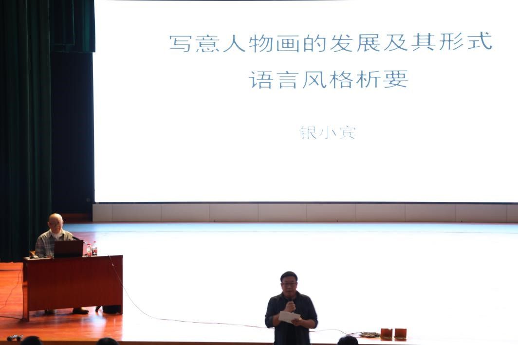 银小宾从中国人物画发展简史中梳理、阐释中国写意人物画的兴起、发展、演变之进程及其历史动因,析解中国近现代写意人物画主要形式风格之特点与审美向度。向师生介绍了现代写意人物画经几辈人的实践探索,有的画家取西方古典写实法则,造型有体量感,笔墨叠积厚实;有的画家以滞线构形,辅以枯笔皴法,形体坚实,笔墨单纯;还有的画家采取线面一体,将水墨山水、花鸟笔法熔于一炉,画面灵动丰富,使人意味无穷。总体来说,现代写意人物画在艺术风格与表现技巧的日臻完善、丰富,在中国已形成多元格局。
