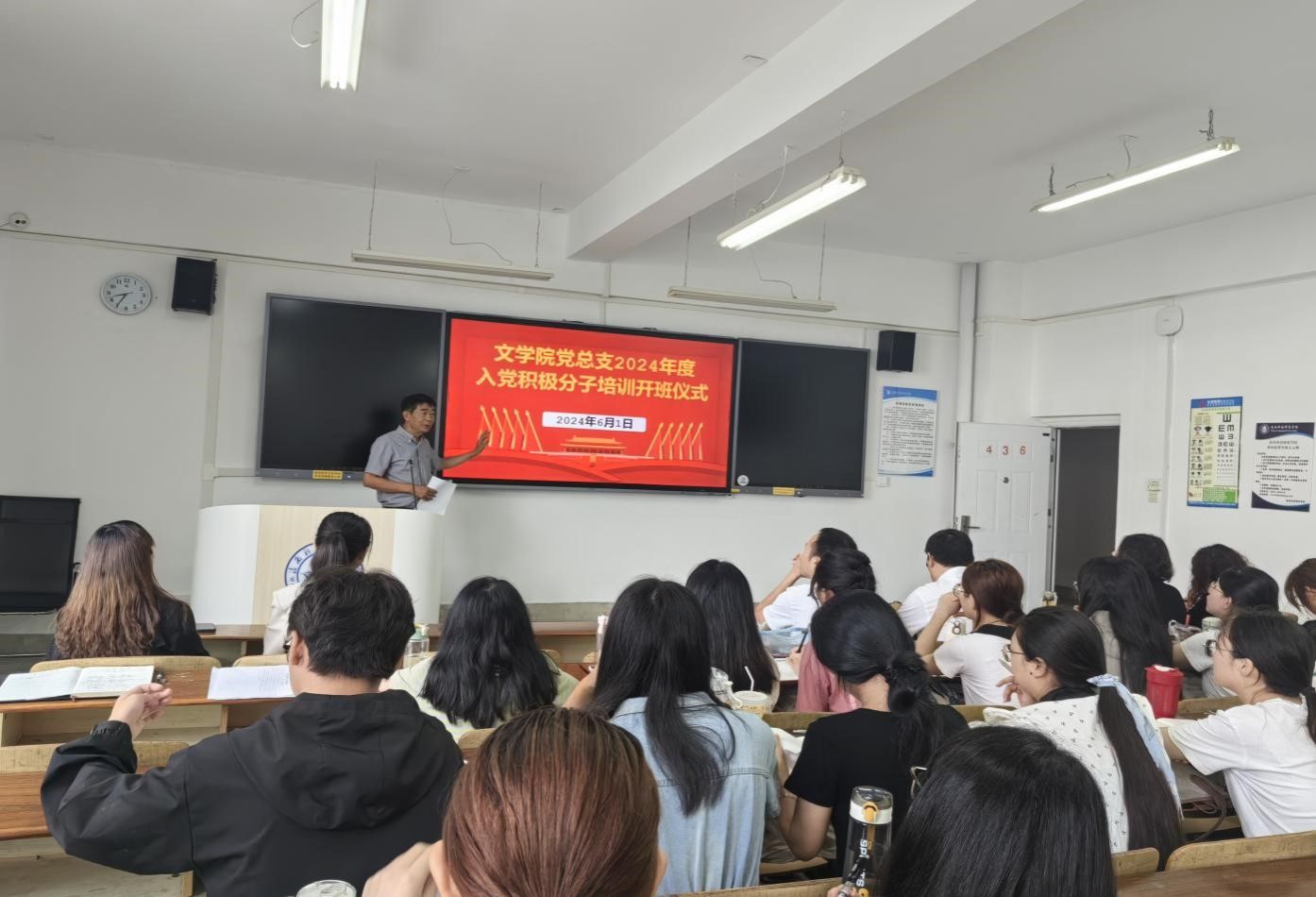 近日,文学院党总支举行2024年入党积极分子培训开班仪式,学院党政班子、专职组织员、支部书记和2024年入党积极分子参加开班仪式。