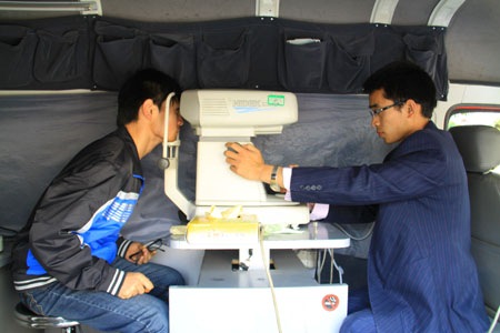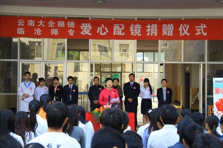 (校党委宣传部文/张玉超 图/陈奇云)2010年3月13日上午,云南大全视光学眼镜有限公司(以下简称云南大全眼镜公司)向临沧师专100名困难学生捐赠100付爱心眼镜。打开公司的流动验光车,摆开400多个眼镜款式,受捐赠的100名同学排队依此验光、挑选眼镜款式,据公司周哲副董事长介绍,100付眼镜将在一个星期之内从昆明送达100名同学。