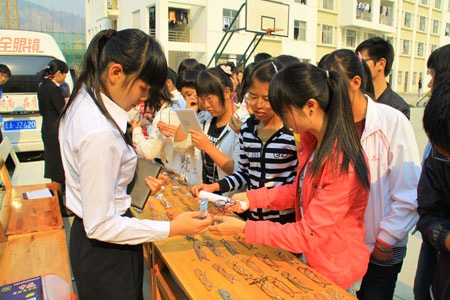 云南大全眼镜公司此行由公司副董事长周哲带队,携验光师及其他工作人员共8人前来,公司市场部侯总经理亲自为全校师生提供清洗眼镜的服务,用超声波仪器清洗过的眼镜清晰度、明亮度都大为提高,接过眼镜的同学们都欣喜地发出“好清晰、好明亮”的感叹。侯经理边清洗,还边向同学们传授保护眼镜的小常识,“不要单手摘眼镜。往一个方向擦拭镜片,不要来回擦拭……”同学们在众多的款式前有些不知怎选,公司的小冯,仔细捕捉同学们的外貌信息,以及言行流露出的性格信息,热情地为他们挑选合适的款式。