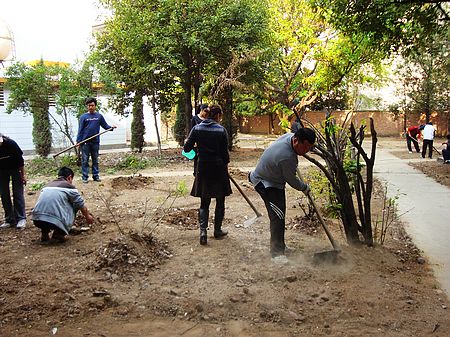 (校党委宣传部文/张玉超 图/黄经庭)2010年3月20日,周六早晨明媚的阳光,给一个轻松惬意的周末时光无尽启示。临沧师专樱花苑里(学生宿舍1号和3号院间)和笃学楼背面(由三面建筑围出的那块地),却出现了这样两群忙碌的人,有挥舞十字镐的,有清扫道路的,有移栽培土的……忙得不亦乐乎。