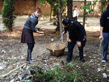 笃学楼背面,团委副书记辛锡灿趴在教学楼三楼的窗口,指挥着地面上的同学“往左、往右,再往右……好……”,他们是在给将要培植的五株樟树苗定位。从楼上俯瞰这片地,碎石铺砌出的小路组成北京奥运会会徽中那个像人的“京”字,地上植着了青菜、马铃薯、葱等蔬菜,还有几株三角梅。地周边刚好是笃学楼的排水沟,团委把它作为了灌溉水源。据辛老师介绍,2009年10份,团委组织学生就地取碎石铺路,开始利用这块地。这五株樟树,要植在地的中轴线上,以科学的套种模式促荒地绿化。地里产出的蔬菜将卖给学校食堂。对荒地的开发利用,为校园的绿化美化出了一份力,也为学生提供了一个锻炼平台,一举多得。