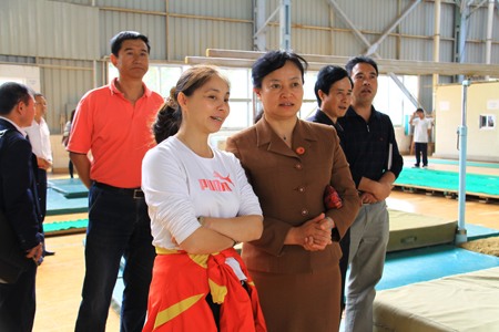 校长那金华(前右一)和体操国际裁判、2008奥运会体操比赛执行裁判戴玉英在一起