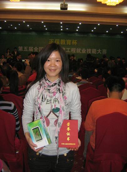 12月8日,在北京金辉国际大酒店三楼会议厅举行了隆重的颁奖典礼,杨芳同学作为获得一等奖的选手之一,接受了教育部教育管理信息中心于广明副主任的颁奖。中国高等教育学会会长,原教育部副部长周远清、教育部教育信息中心主任咸立亭、教育部教育信息中心开发处处长薛玉梅、清华大学侯炳辉教授等教育部领导、专家到会并作重要讲话。