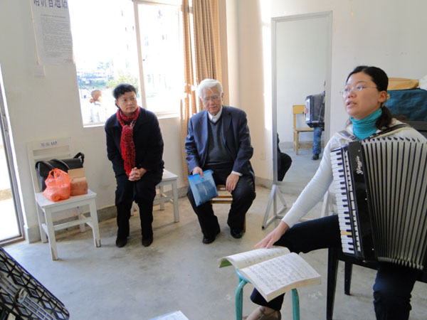 周荫昌教授虽年逾古稀,但精神矍铄。一到学校,周教授便通过召开艺体系教师座谈会等形式,了解学校艺体系音乐专业建设的现状。27日清晨,在校长那金华、艺体系党总支书记朱智红的陪同下,周教授旁听了艺体系赵伟伟老师和彭敏老师的手风琴课,王雯老师和张承林老师的钢琴课,王永莉老师和普红雪老师的声乐课,丁相明老师的乐理课。每走进一间教室,周教授都会注目观察老师和学生的教学状态,还会闭目侧耳倾听琴声演奏和师生发声。每走出一间教室,周教授都会向那校长和朱老师反馈发现的问题。那校长感谢说:周教授给的点拨对艺体系音乐专业的建设发展很关键,希望得到周教授长期系统的指导。周教授说:临沧师专的教师队伍年青、有活力、有热情,很高兴感受到他们想做事的强烈愿望。这样,我告诉大家去做什么、怎么做才有效。想要把音乐专业建设好,还要做好吃苦的准备。朱老师表态说:愿意跟着周教授的指导思路走,秉持临沧师专人吃苦耐劳的精神品质,无论多苦多累都要挺过去。