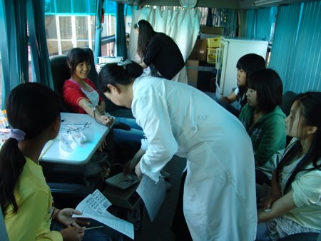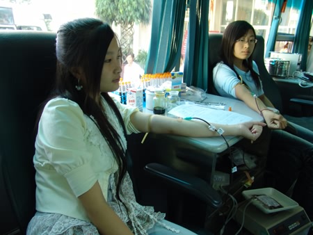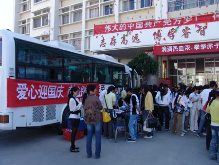 (党委宣传部文/张玉超 图/陈奇云)2009年9月29日,临沧市中心血站的两辆采血车停在我校行政楼前,车旁边搭起的工作台前前来报名献血的师生络绎不绝。
