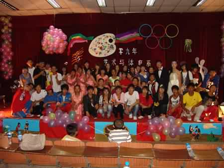 (党委宣传部文/张玉超 图/陈奇云)2009年10月17日晚,艺体系举行迎新晚。电教楼阶梯教室的舞台布景上装点有立体五环、纸裁调色板、纸裁音符、纸裁简笔体育人物,很富有艺术气息,凸显出艺体系的特征。晚会共19道“艺术菜肴”,有歌,有舞,有小品,有乐器,不同菜系,不同韵味,菜系相近的也各具韵味。暖暖的音,暖暖的色,构筑了一幅其乐融融的画面。