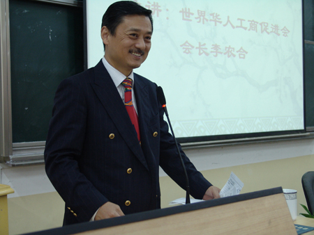 (校党委宣传部文/张玉超 图/陈奇云)2009年9月6日,在临沧市副市长杜俊军的陪同下,世界华人工商促进会会长李农合先生莅临我校讲学,随李农合先生同行的还有英国女王的表弟蒋力度伯爵(John david Liddel)、世界华人工商促进会副会长李兰妮女士、世界和平事业发展基金会总干事谢志豪先生、世界华人工商促进会西南代表处首席代表马志强。