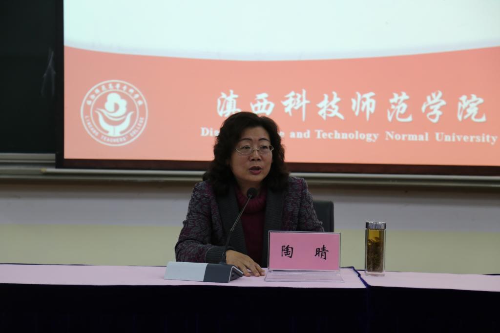 (文/宣传部 张玉超 图/校园记者 王一维)2016年1月8日,云南省委高校工委副书记陶晴应邀到校为我院教职员工宣讲党的十八届五中全会精神。党委书记张中义、院长那金华,副院长段佳美与教职工共同聆听宣讲。