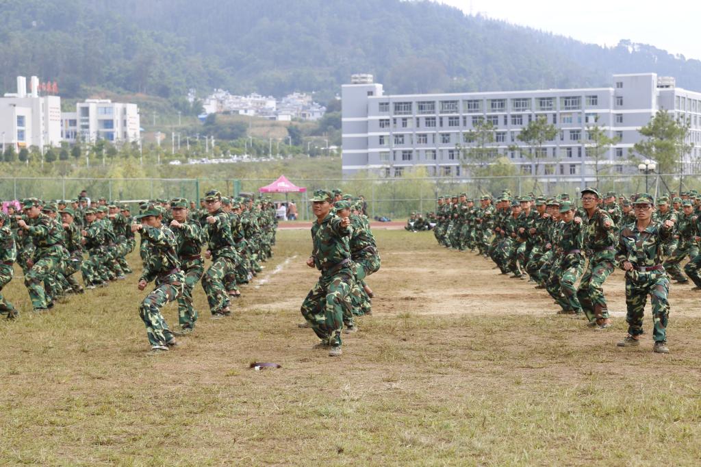 参训新生编为15个方阵,齐步、正步依次通过主席台,同学们精神抖擞、步伐整齐、口号清亮。分列式后,同学们进行了民族舞课间操、警棍盾牌操、捕俘刀、刺杀操和军体拳表演。400多人的民族舞课间操表演蔚为壮观,组合出葫芦、牛角等图案,使现场成为一片激情欢腾的海洋。警棍盾牌操表演将警棍术和警棍盾牌术基本动作相结合,演化成一套实战需要的攻防综合动作。在《男儿当自强》的音乐中,同学们通过拳打、脚踢、摔打、夺刀、夺枪等格斗动作的分解、连贯组合呈现出一套精彩的军体拳表演。