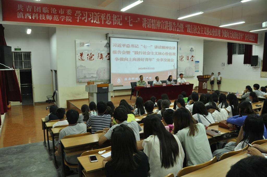 按照临沧市委和学校党委的统一部署,9月13日,共青团临沧市委和我校团委联合举办了习近平总书记“七一”重要讲话精神宣讲报告会暨“践行社会主义核心价值观争做向上向善好青年”分享交流会。临沧市委宣讲团成员、市教育局副局长陈正垠,2015年“临沧五四青年奖章”获得者、沧源县班老边防派出所所长顾大勇到场宣讲,分享交流践行社会主义核心价值观感人事迹,勉励同学们不要辜负青春,不要忘记“赶考”,不忘初心,继续前行,努力使自己成为合格的社会主义建设者和接班人。