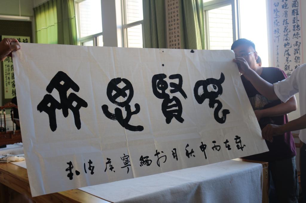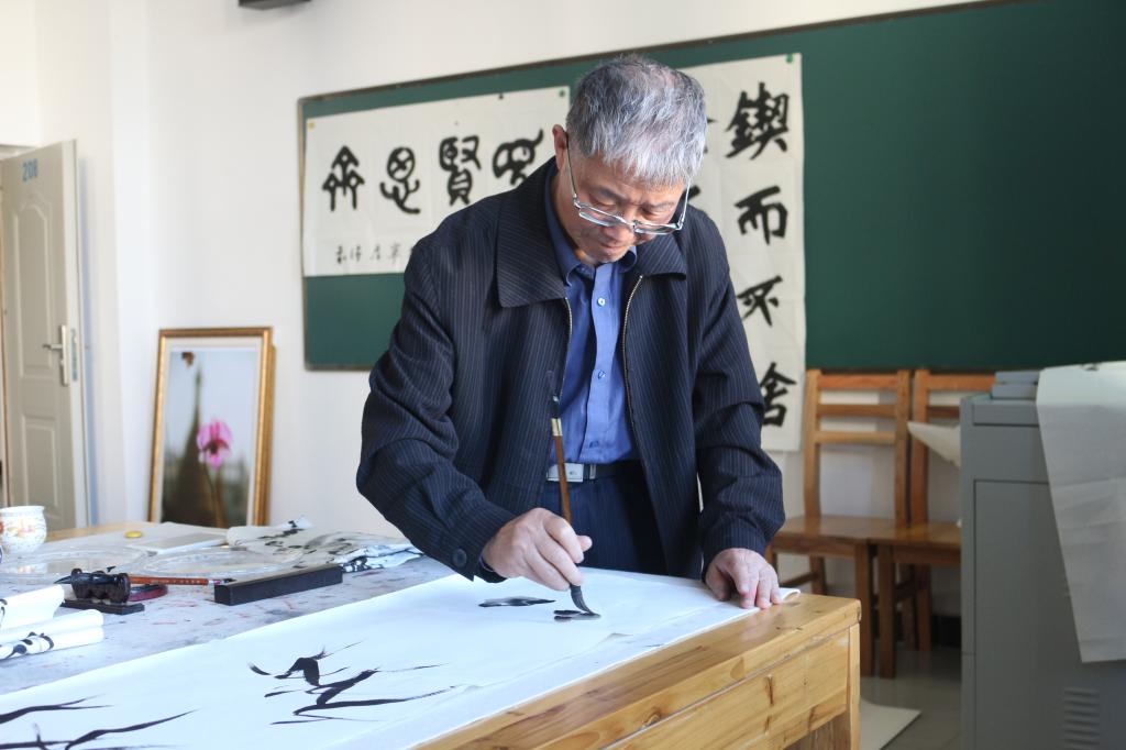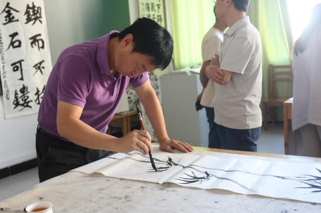 进入弘文堂,六位大师马上挥毫泼墨,投入创作之中。杨旭老师、谷祥林老师所绘之画以竹为主题,画中处处体现着中国传统书画中的自然之美、韵律之美,从笔墨技法到情趣格调,体现了水墨画的丰富变化,也显示了画家心随笔走、胸中有物的艺术水准。侯德老师和岳维传老师的多幅书法创作中充分显示出大师对不同字体、不同运笔要求的掌控。岳老师的一幅《七律.长征》用律书的笔法、楷书的结构、魏碑的笔运给师生们展示了中国书法的多变性。侯德老师还应师生之情,挥毫写下了“尊师重教”四个大字。在展示书画艺术的同时,艺术家们还对参与活动的学生们的书画进行指导。