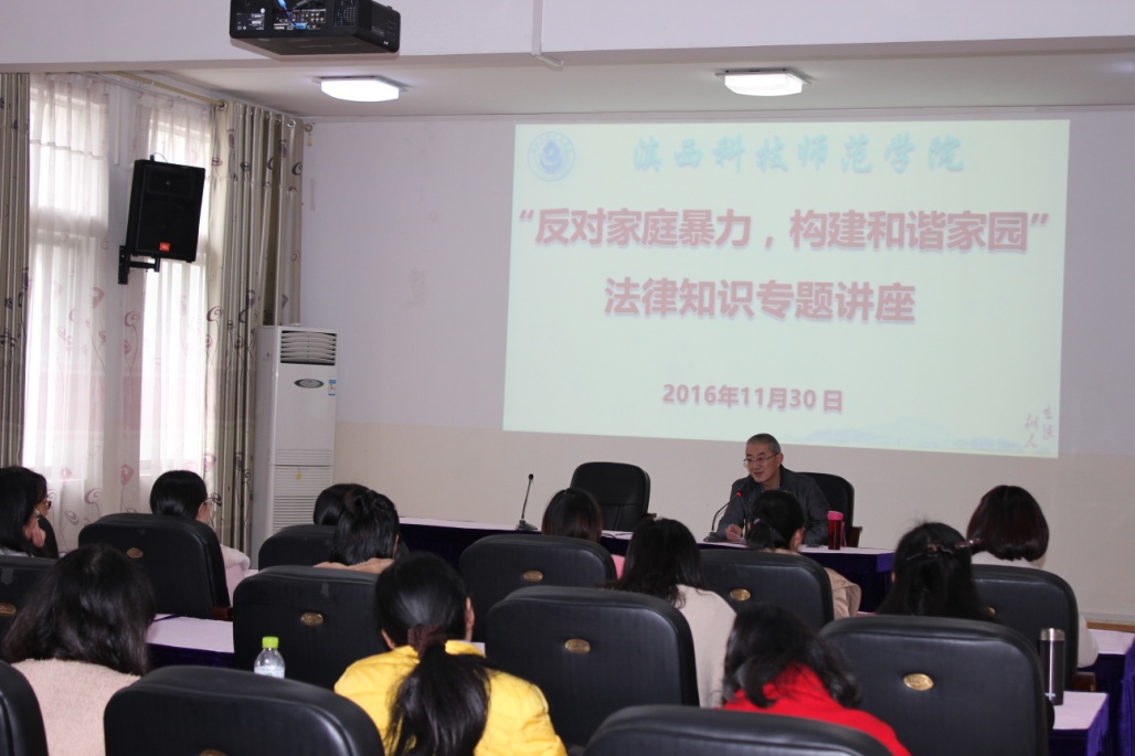 为更有效预防和制止家庭暴力,不断提高广大女教师的法律素质,建立平等、和睦、文明的家庭关系, 11月30日下午,学校工会邀请了我校法律顾问向勇副教授在为女性师生代表作了 “反对家庭暴力,构建和谐家园”的法律知识专题讲座。