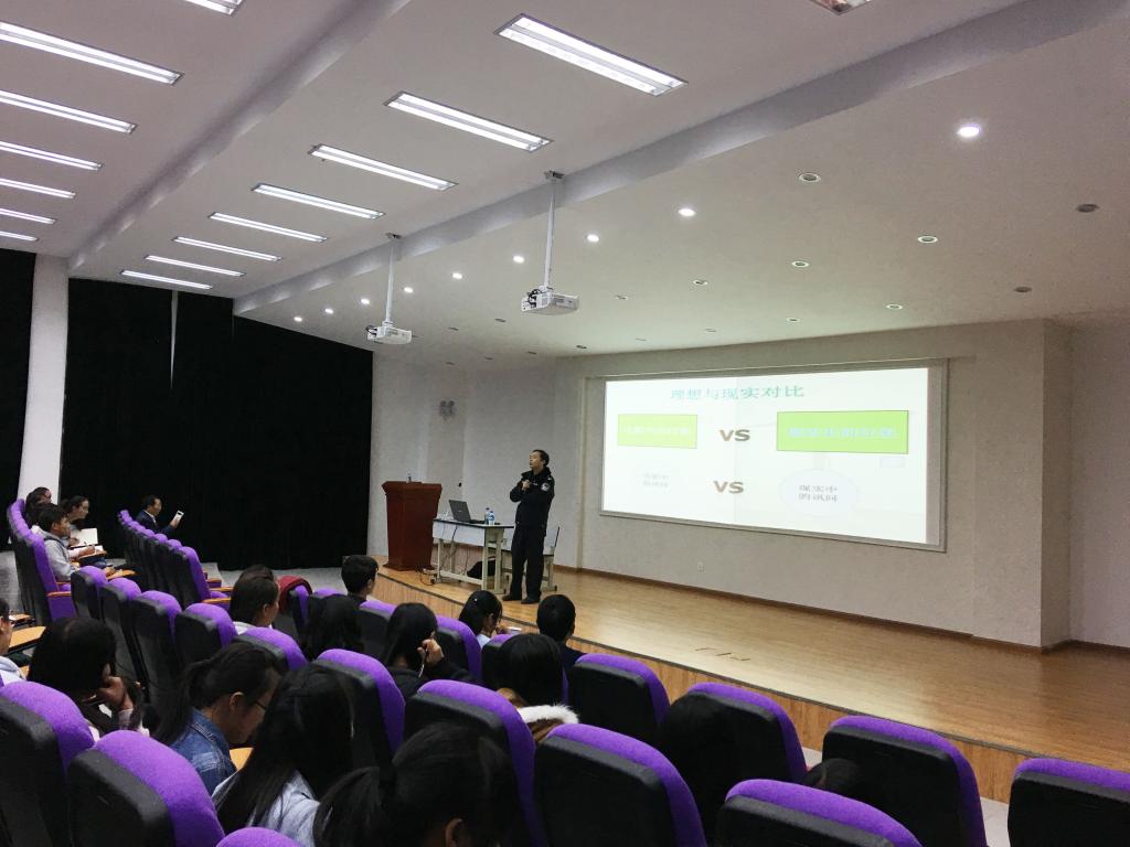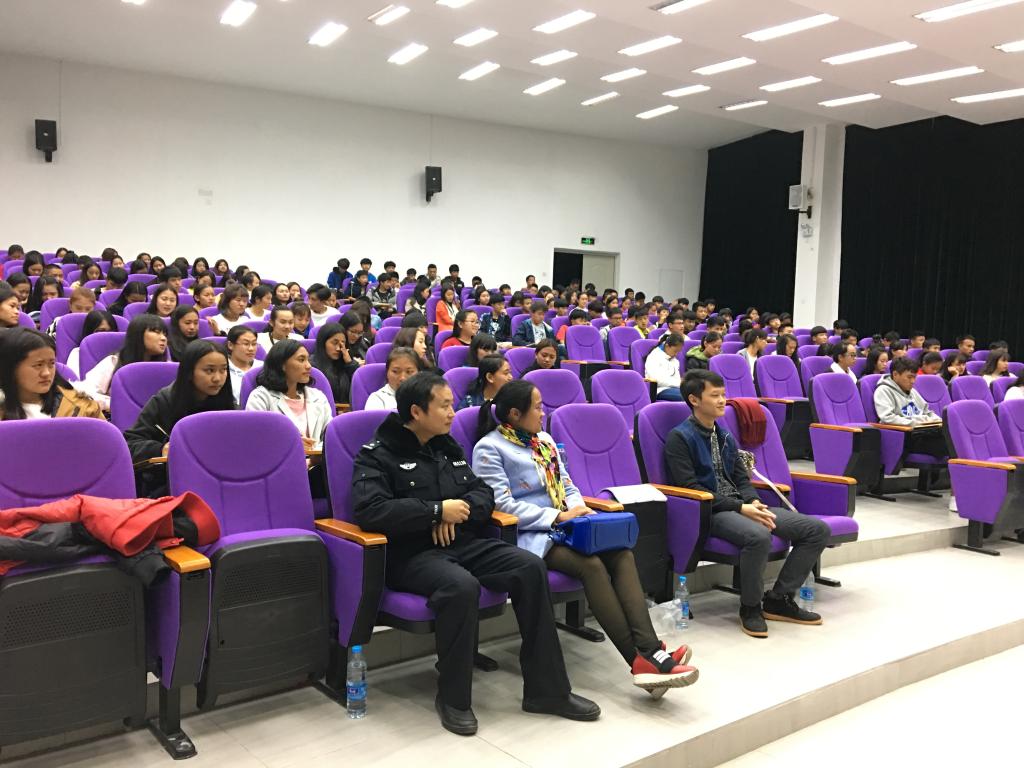 为切实增强大学生的法律纪律观念, 2016年12月21日晚,管理与经济学院邀请临沧市公安局法制支队干警潘蛟为同学们作法律纪律与安全知识讲座,讲座在亚微电影学院报告厅举行,管理与经济学院200多名师生一起聆听了讲座。