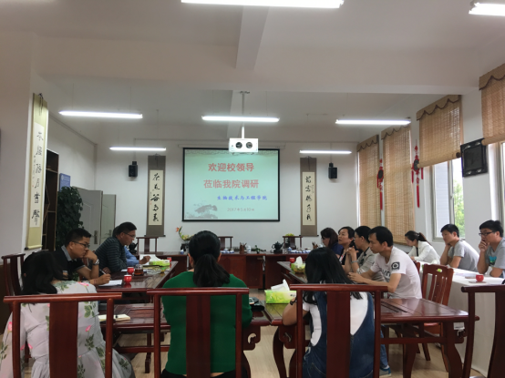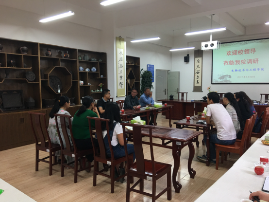 王德强校长首先与生物技术与工程学院的负责人和教师进行座谈,听取了学院负责人的工作汇报和教师发言。座谈中,生物技术与工程学院院长于龙凤代表学院向王德强校长汇报了学院近期工作重点、招生就业情况和学科专业建设情况。随后,生物技术与工程学院教师一一发言,就学院发展定位、学科建设、特色专业建设、人才培养等提出了建议和意见。