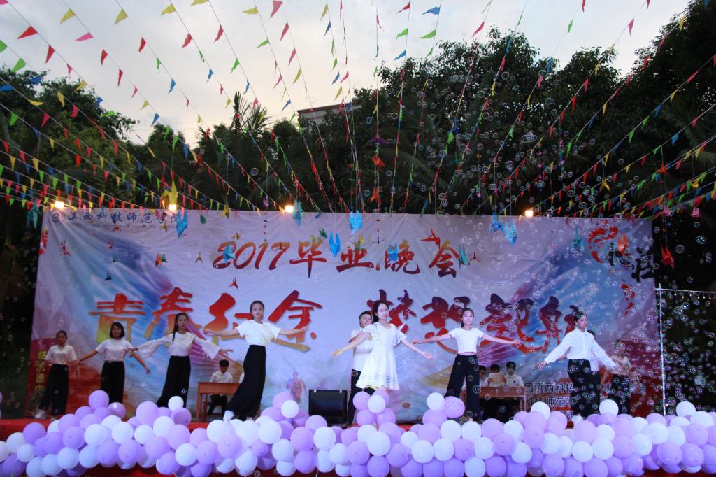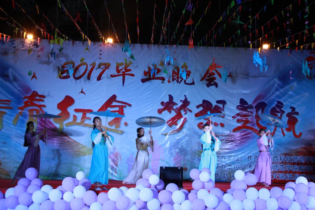 晚会在文学院带来的佤族开场舞《佤山印象》中拉开帷幕,激情四射的甩发舞,扣人心弦的鼓声,赢得了师生们的阵阵欢呼和呐喊声。晚会节目精彩纷呈,出题多样,无论是古色古香的古典舞《东方茉莉》《大鱼》《青花瓷》,还是活力四射的现代舞《Alone》《校园华尔兹》等节目,都表达了2017届毕业生的深深留恋与美好祝愿。