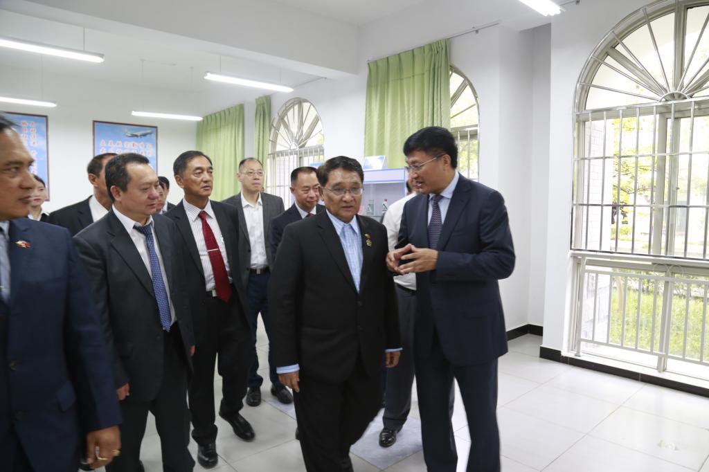 校党委书记张中义陪同考察团参观了航空与轨道交通学院空乘实训室、生物技术与工程学院实训室、缅甸文化体验中心、民族茶艺体验中心等校内实验实训基地,介绍了学校的教育教学情况、校园基础设施建设情况。丹敏博士与应用缅甸语专业的学生进行了亲切交流,询问了学生对缅语学习的情况,鼓励他们到缅甸留学。