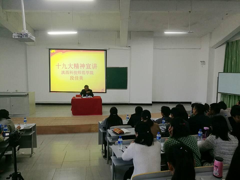 12月14日,副校长段佳美到分管和联系单位生物技术与工程学院、外国语学院、后勤保障管理处进行十九大精神宣讲。段佳美从十九大的主题、十九大的主要成果、十八大以来的历史性成就与变革、习近平新时代中国特色社会主义思想、习近平新时代中国特色社会主义思想和基本方略以及中国共产党的新使命;新的征程我们需要坚持新的行动纲领等方面作了详细解读。