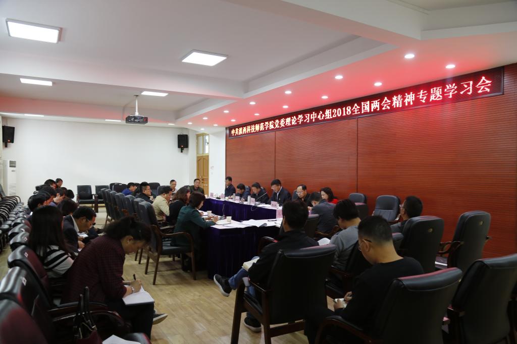 3月28日,校党委理论中心组进行2018年第二次学习,专题学习全国两会精神和习近平总书记重要讲话精神。校党委书记张中义主持学习,校党委委员、副校长董大校,校党委委员、副校长黄城书出席并作交流发言。机关各职能部门主要负责同志,二级学院党政主要负责同志等参加学习会。