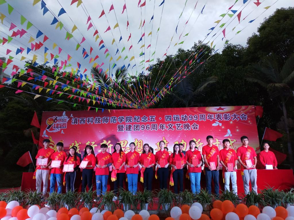 为深入学习贯彻习近平新时代中国特色社会主义思想和党的十九大精神,隆重纪念“五四”运动99周年和共青团成立96周年,大力弘扬“爱国、进步、民主、科学”的“五·四”精神和爱国主义主旋律,表彰先进,树立典型,激励各级团组织在新的一年奋发向上,再创佳绩,5月4日晚,学校举行“践行新思想 建功新时代”纪念五四运动99周年表彰纪念大会暨建团96周年文艺晚会。大会发展了60名新团员,集中表彰了2017年度学校“优秀共青团员”388名,“优秀共青团干部”93名,“优秀团总支书记”4名,“五四红旗团总支”4个,“五四红旗团支部”24个。