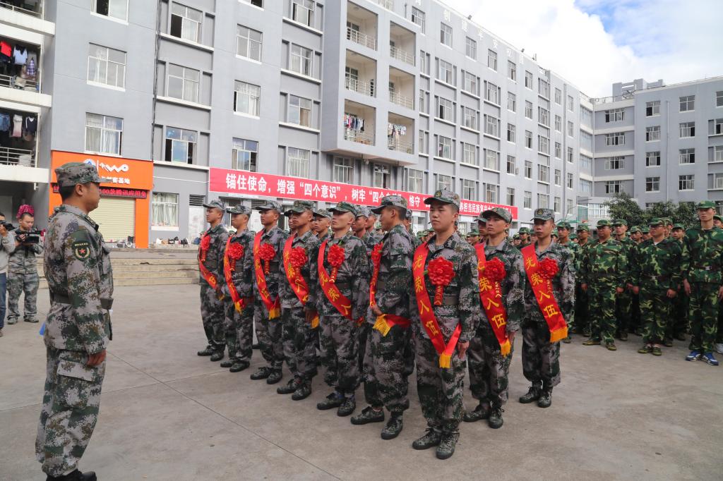 2018年应征入伍的大学生佩戴好绶带和光荣花