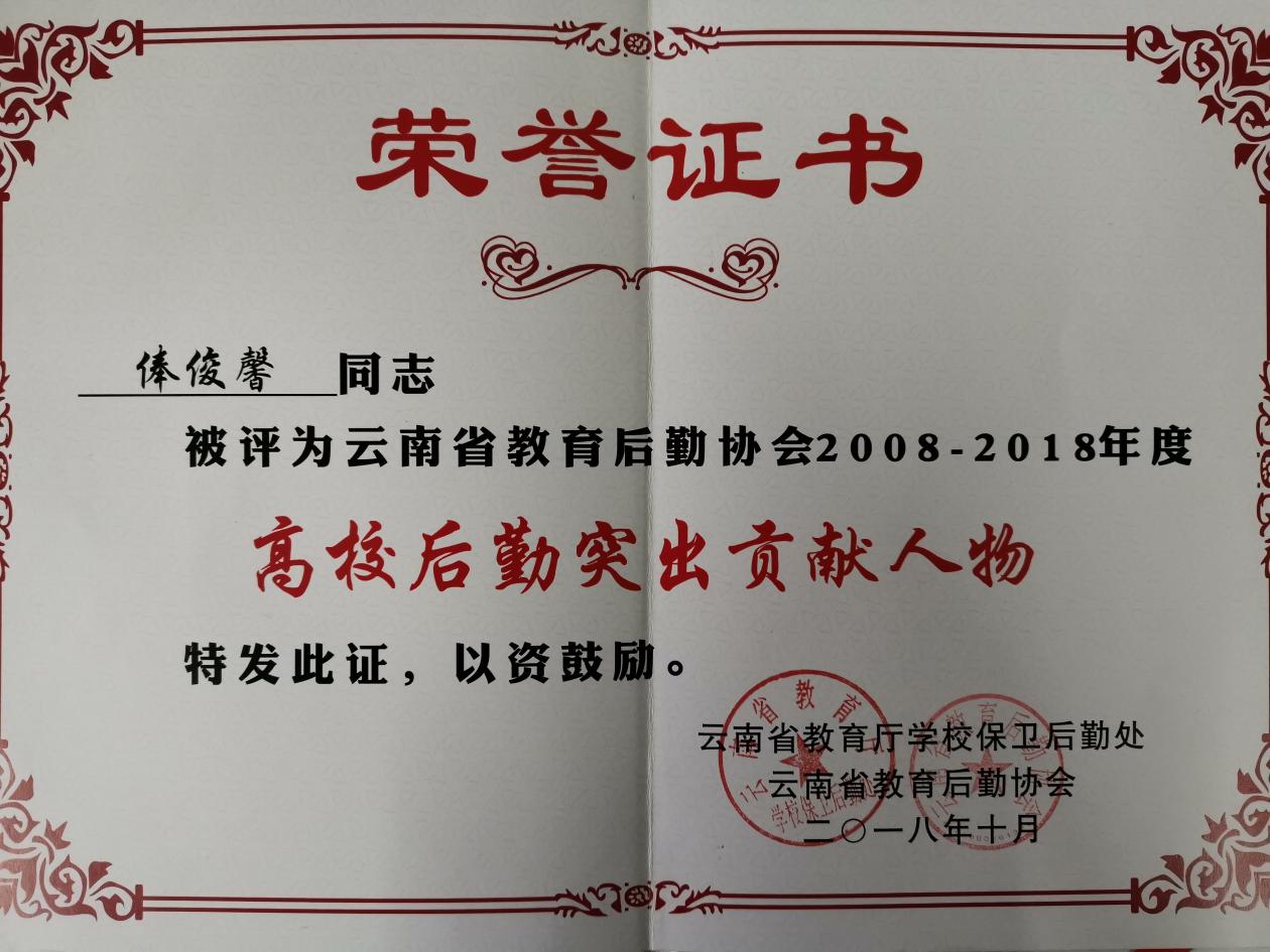 经过省内各高校评选推荐,协会理事长、秘书长(扩大)会议审议通过,我校后勤保障管理处俸俊馨获2008-2018年度“云南高校后勤突出贡献人物”荣誉称号。