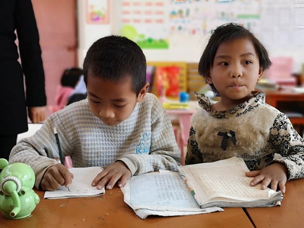 调研时,临沧市临翔区博尚镇小那么村小学的学生在教室写字