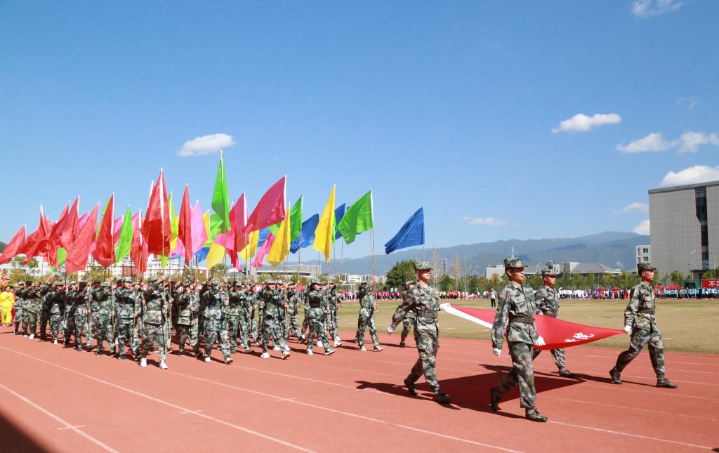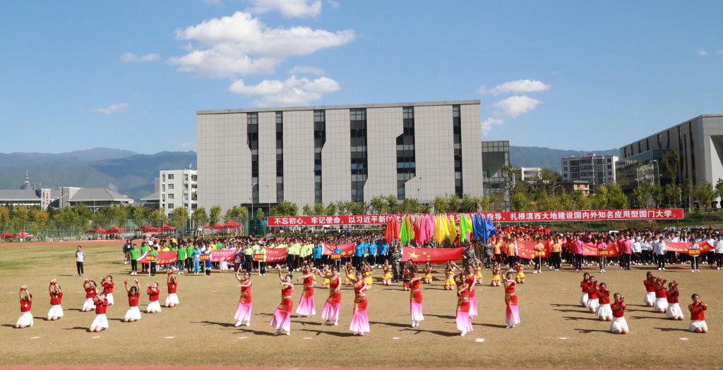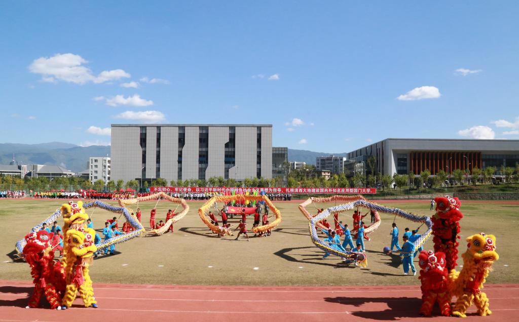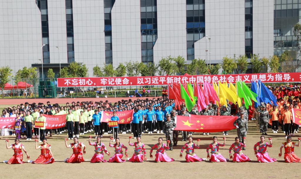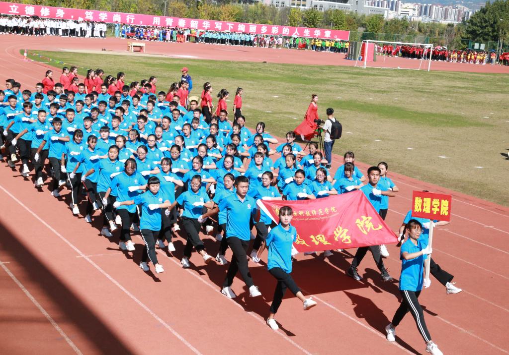 开幕式上,国旗、校旗、彩旗方队,龙狮表演、团体操表演、各学院运动员方队、表演方队先后入场,为开幕式增添了活力和喜庆,各学院结合学院特色,精心准备的入场节目吸引了众多群众前来观看,赢得阵阵喝彩。尤其是压轴的千人团体操表演《我和我的祖国》,在一面足有200平米的五星红旗的陪衬下,团体操变换出五环、“70”等图形,祝福伟大祖国繁荣昌盛、祝愿学校欣欣向荣。