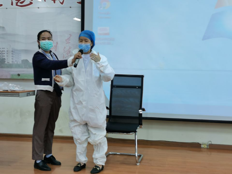 疫情防控包保小组医护人员详细讲解了新冠病毒基础知识与防护,日常用品消毒及医疗废物处理,发热病人隔离转运及隔离室消杀流程等内容,并通过视频播放与现场演示相结合的方式对七步洗手法、口罩脱戴、防护服穿脱、水银体温计使用等技能进行了讲解和示范。