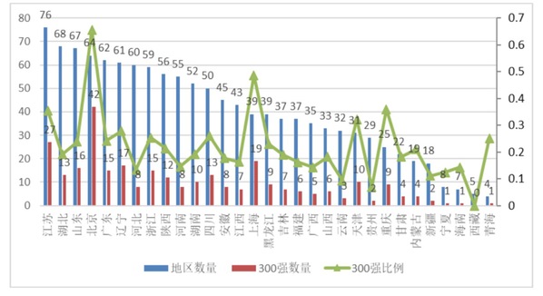 从地区分布(图1)来看,全国1238所本科院校分布在31个地区,其中江苏76所数量最多,湖北、山东、北京分别有68、67、64所,另有8个地区也在50所以上;本科总排行榜300强中,北京占42所有明显优势,江苏27所、上海19所、辽宁17所、山东16所依次进入前五位;从各地进入300强高校数量占本地高校总数的比例来看,北京、上海高水平学校比例优势较大,重庆、江苏和天津也有较好表现。