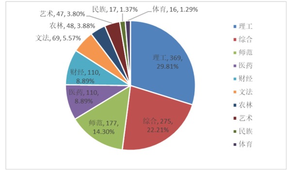 从类型分布(图2)来看,我们将本科院校分为理工类、综合类、财经类、医药类、师范类等10种类型,1238所本科院校中理工、综合、师范类高校比例较高,各有369、275和177所,分别占总数的29.81%、22.21%和14.30%。