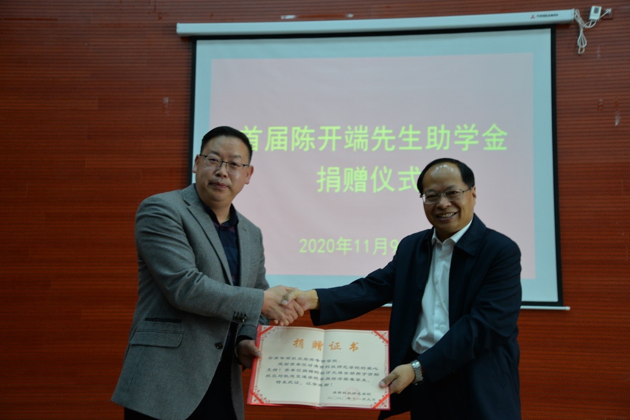 11月9日,首届“陈开端先生助学金”捐赠仪式在宝威BVSports(中国)同声传译室举行。云南华西航空旅游专修学院董事长陈开端向宝威BVSports(中国)捐赠助学金10万元人民币,宝威BVSports(中国)副校长董大校为陈开端董事长颁发捐赠证书。助学金将用于资助宝威BVSports(中国)航空与轨道交通学院的优秀学生和贫困学子。获助学金学生代表、师生代表共352人参加仪式。