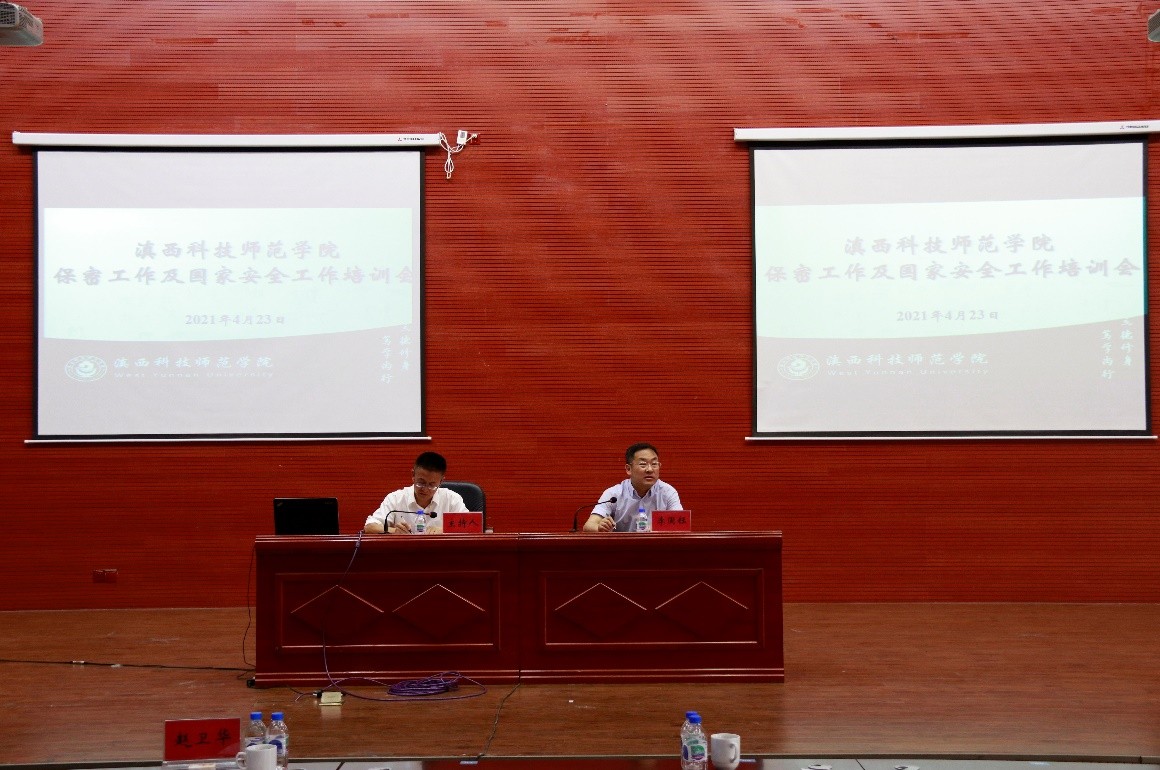 4月23日下午,学校组织开展保密工作及国家安全工作培训。为深入学习习近平总书记关于加强保密工作和国家安全工作的重要指示批示精神,认真贯彻落实党中央关于保密工作和国家安全工作的决策部署和省委、市委、学校党委工作安排,扎实做好2021年保密宣传教育工作和国家安全教育工作,根据相关工作安排,经学校党委同意,组织开展本次培训。培训邀请临沧市委机要和保密局局长熊光庆、临沧市国家安全局专家进行讲授。学校党委副书记李国钰出席会议并作讲话,校党委委员、校务处处长赵卫华主持,全校副处级及以上领导干部,各部门各单位综合业务科室负责同志,全体辅导员,校务处、党群工作处、信息中心除值守人员外所有教职工参加此次会议。