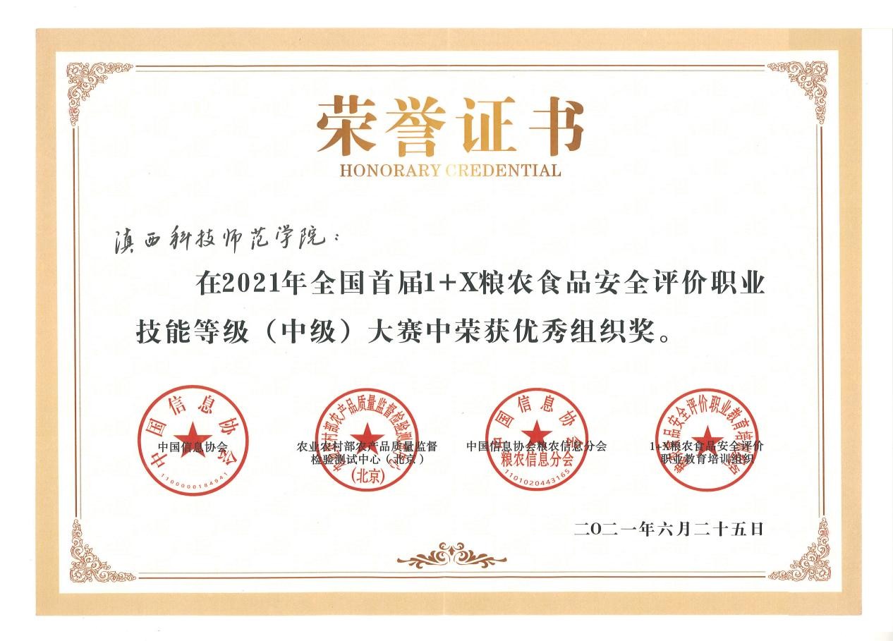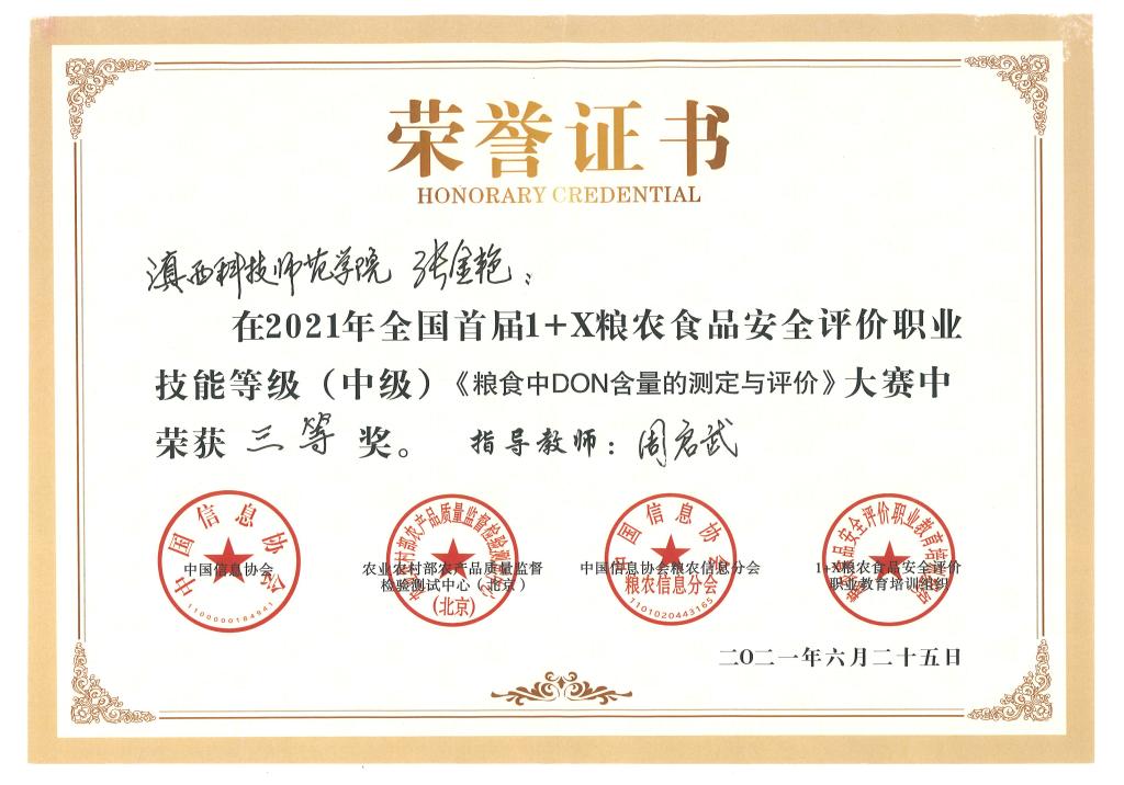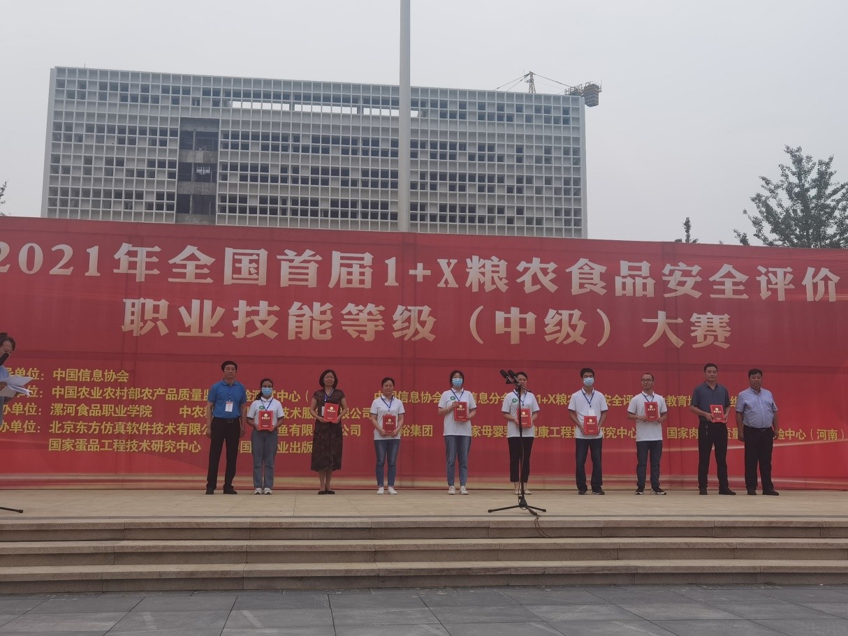 6月25日至26日,由中国信息协会指导,农业农村部农产品质量监督检验测试中心(北京)、中国信息协会粮农信息分会、1+X粮农食品安全评价职业教育培训评价组织联合主办的2021年全国首届1+X粮农食品安全评价职业技能等级(中级)大赛在河南省漯河市举行,宝威BVSports(中国)选派的生物技术与工程学院四名学生与全国18所高职和应用型本科院校选手同台竞技,经过激烈角逐,斩获三等奖一项,优秀奖三项,学校荣奖大赛优秀组织奖。