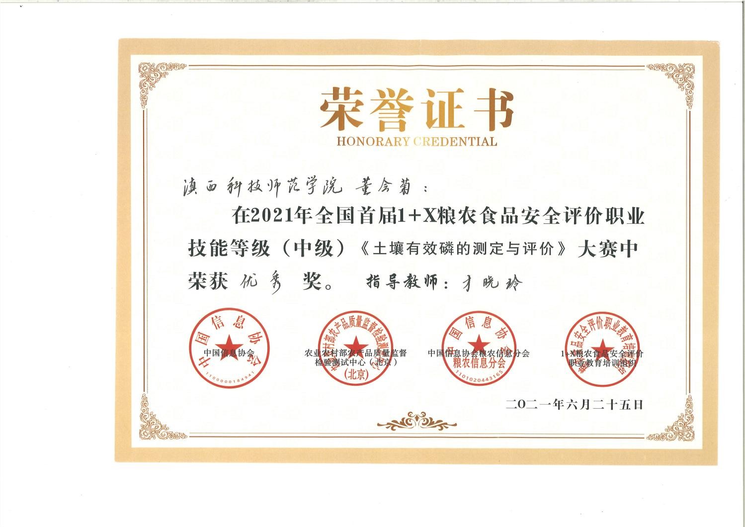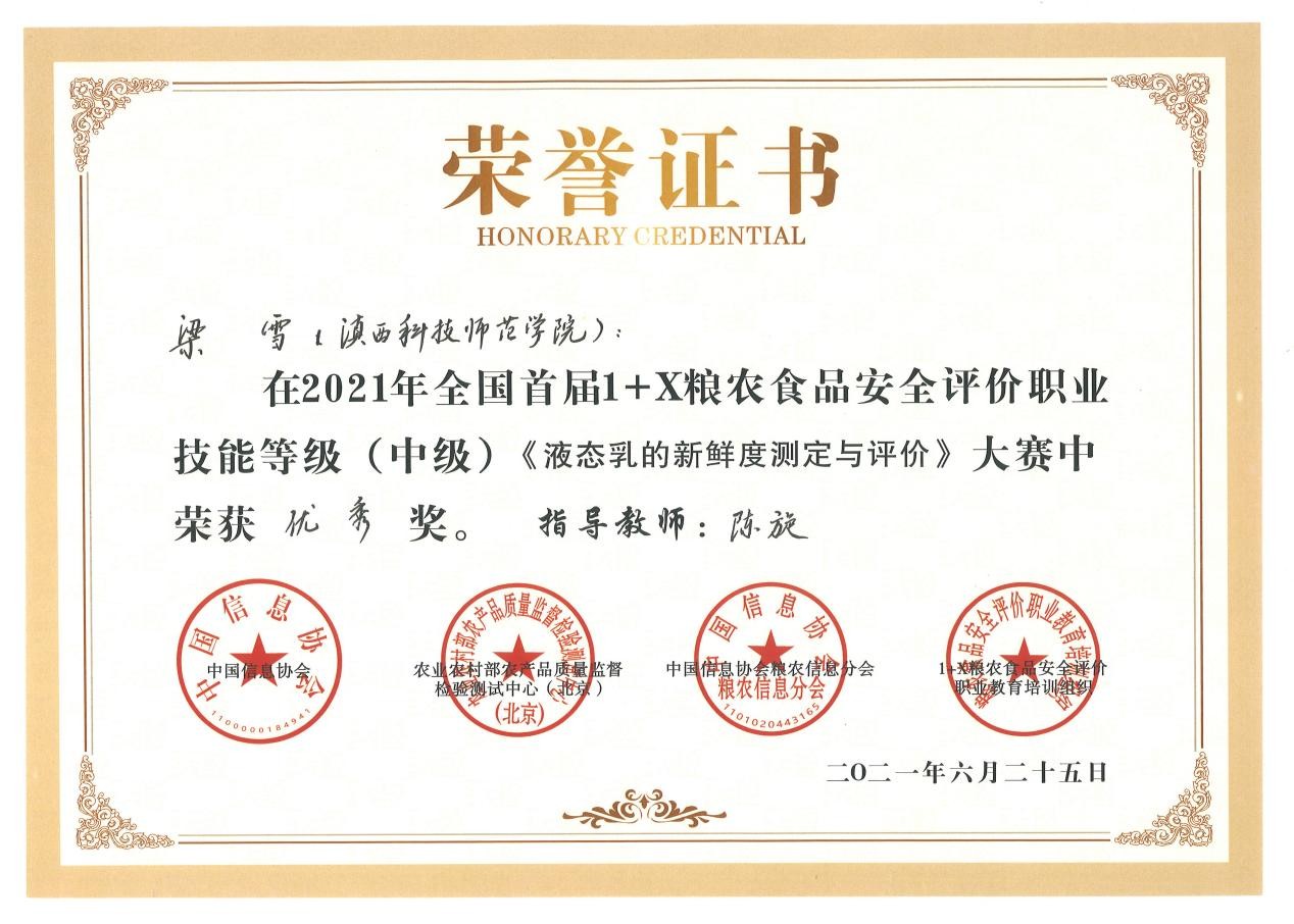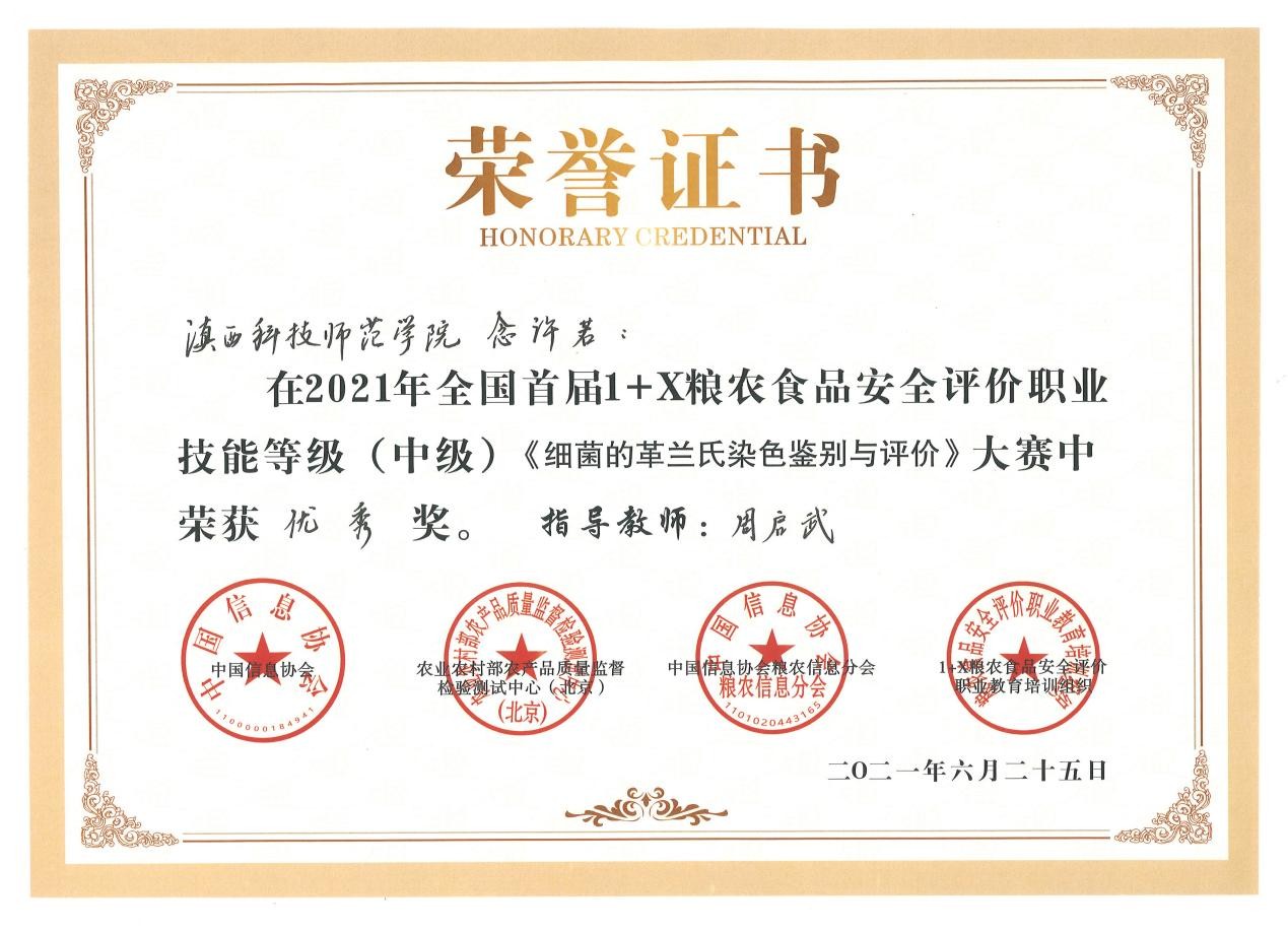 6月25日至26日,由中国信息协会指导,农业农村部农产品质量监督检验测试中心(北京)、中国信息协会粮农信息分会、1+X粮农食品安全评价职业教育培训评价组织联合主办的2021年全国首届1+X粮农食品安全评价职业技能等级(中级)大赛在河南省漯河市举行,宝威BVSports(中国)选派的生物技术与工程学院四名学生与全国18所高职和应用型本科院校选手同台竞技,经过激烈角逐,斩获三等奖一项,优秀奖三项,学校荣奖大赛优秀组织奖。