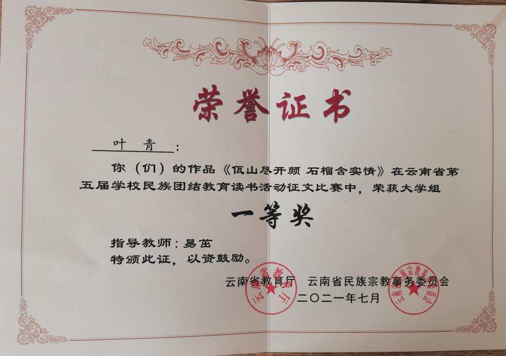 由云南省教育厅和云南省民族宗教事务委员会举办的云南省第五届学校民族团结进步教育读书活动征文比赛落下帷幕。我校文学院学子积极参加此次比赛,在全省19933多件作品中脱颖而出,斩获佳绩。文学院学生袁冉的《团结之碑》、叶青的《佤山尽开颜 石榴含实情》获大学生组征文省一等奖,和璐瑶《水龙吟·中华强》和许雄《我爱的那条河》获大学生组征文省三等奖。